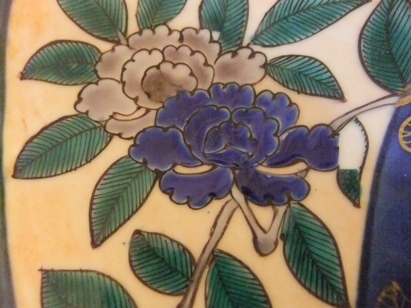金の上に藍で色づけられている牡丹がございます。